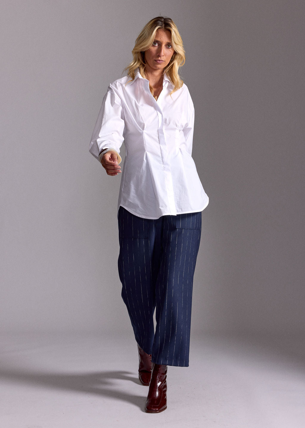 Lauren Vidal réinvente dans cette collection l’incontournable chemise loose avec la sublime pièce Bimba en popeline de coton, ornée de plis au dos et d’un sublime effet froncé sur le haut des manches. Une coupe intemporelle, féminine à souhait, que l’on porte sur un pantalon fitté pour un contraste des coupes du plus bel effet.