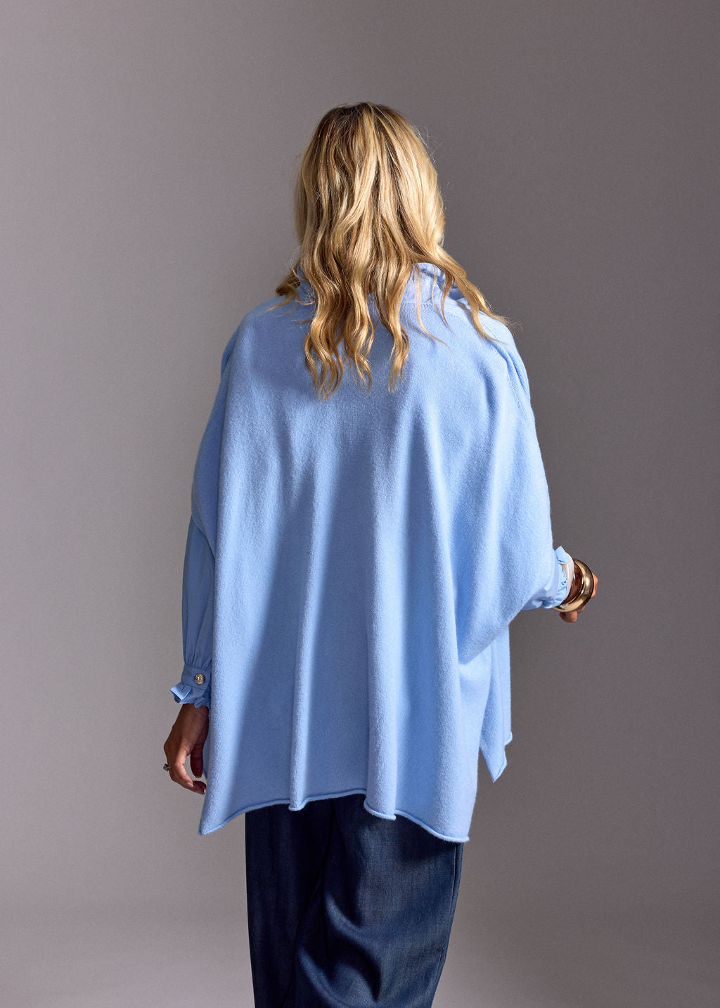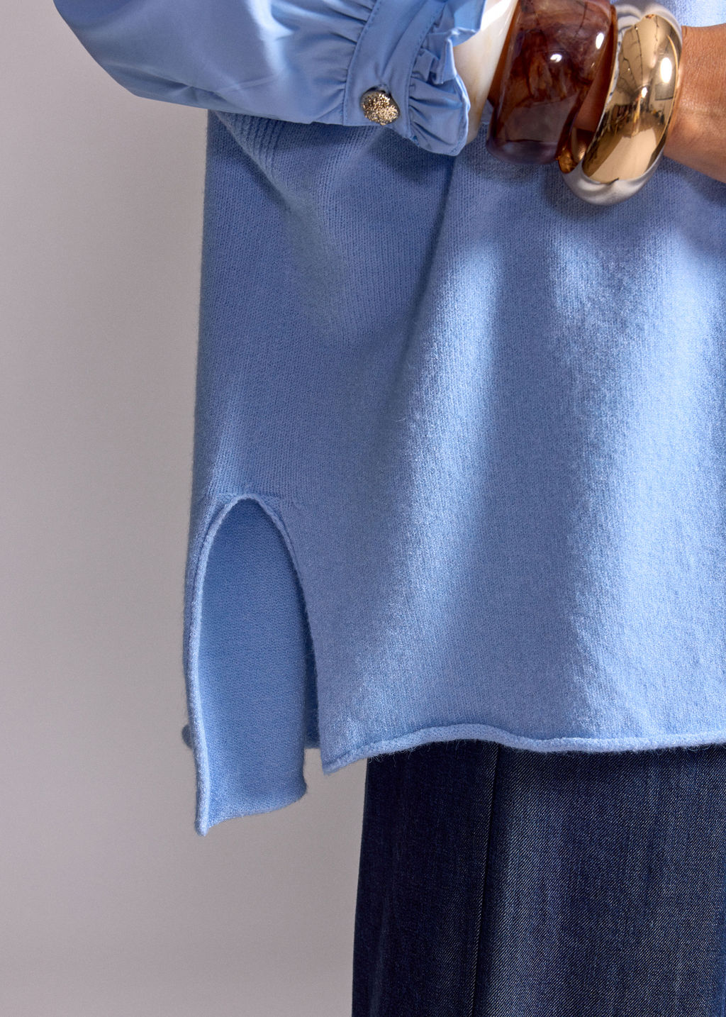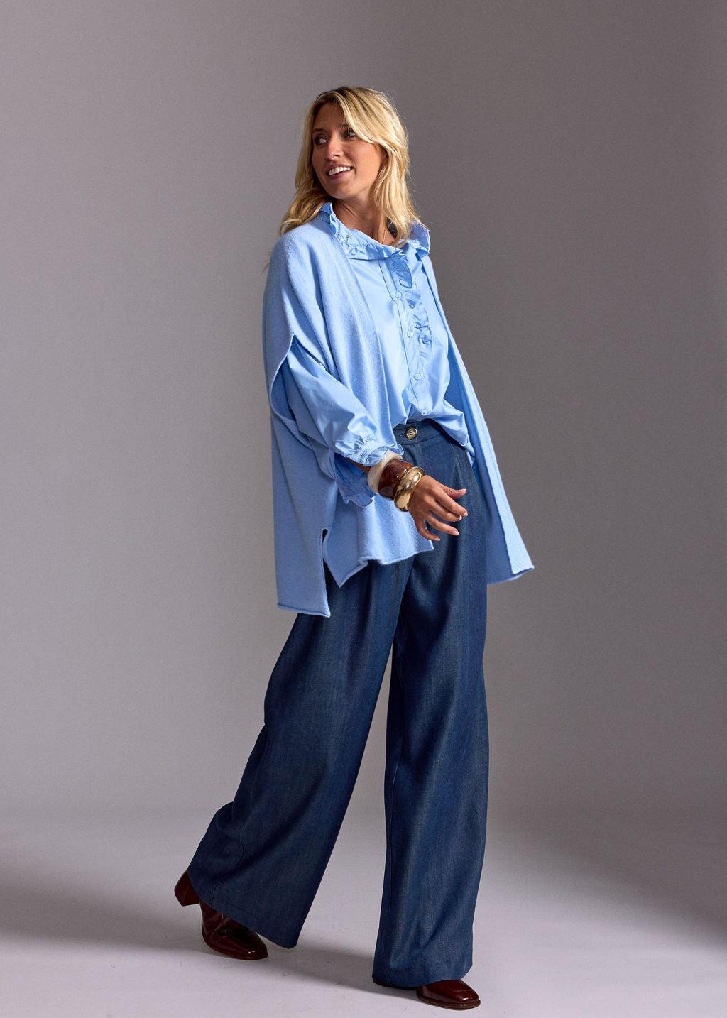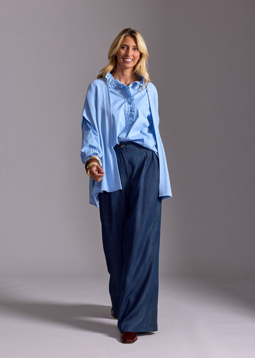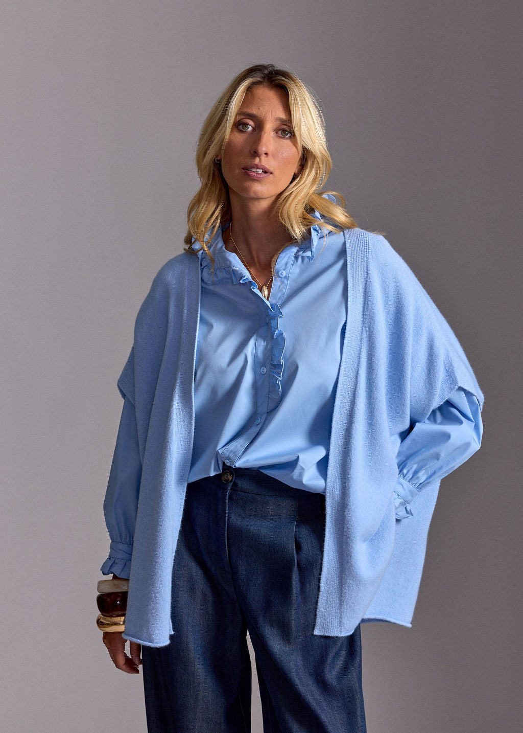 - Notre mannequin porte le gilet sans manches MACHA CIEL avec la CHEMISE VOLANTÉE DIANA CIEL et le PANTALON FLUIDE EN LYOCELL FABIO DENIM